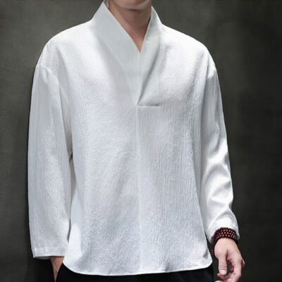 Buddha Stones Simple V-Neck Long Sleeve T-Shirt Men Clothing