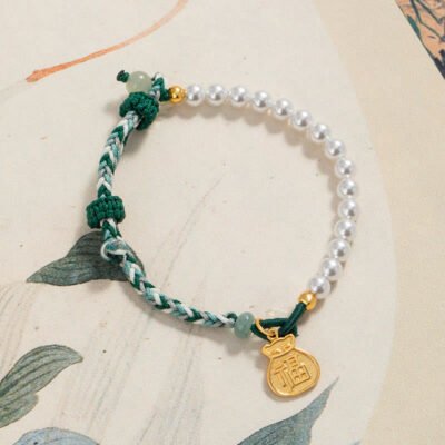 Buddha Stones 925 Sterling Silver Fu Character Lucky Bag Pearl Hetian Jade Wisdom Rope Bracelet