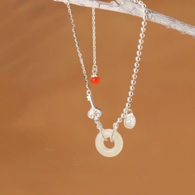Buddha Stones 925 Sterling Silver Hetian Jade Peace Buckle Flower Luck Necklace Pendant
