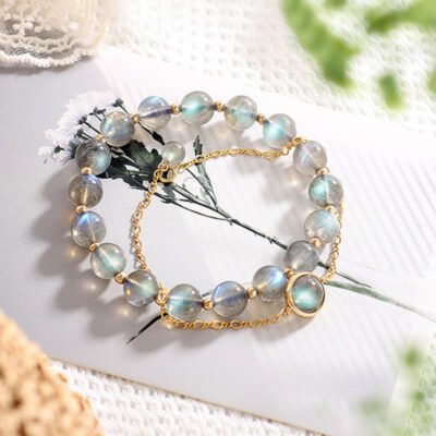 Buddha Stones 14K Gold Plated Jade Butterfly Tridacna Stone Flower Double Layer Luck Bracelet