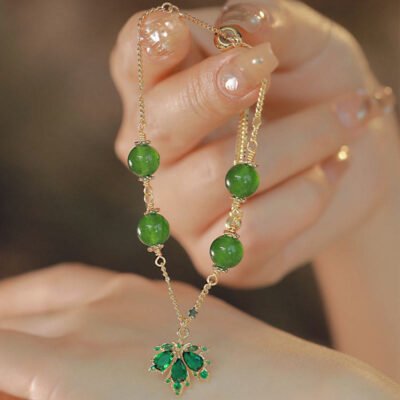 Buddha Stones 14K Gold Plated Jade Butterfly Tridacna Stone Flower Double Layer Luck Bracelet