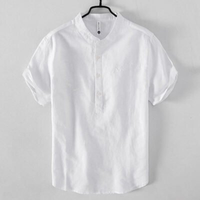 Buddha Stones Soft Embroidery Crane Pattern Stand Collar Cotton Linen Half Button Men’s Shirt