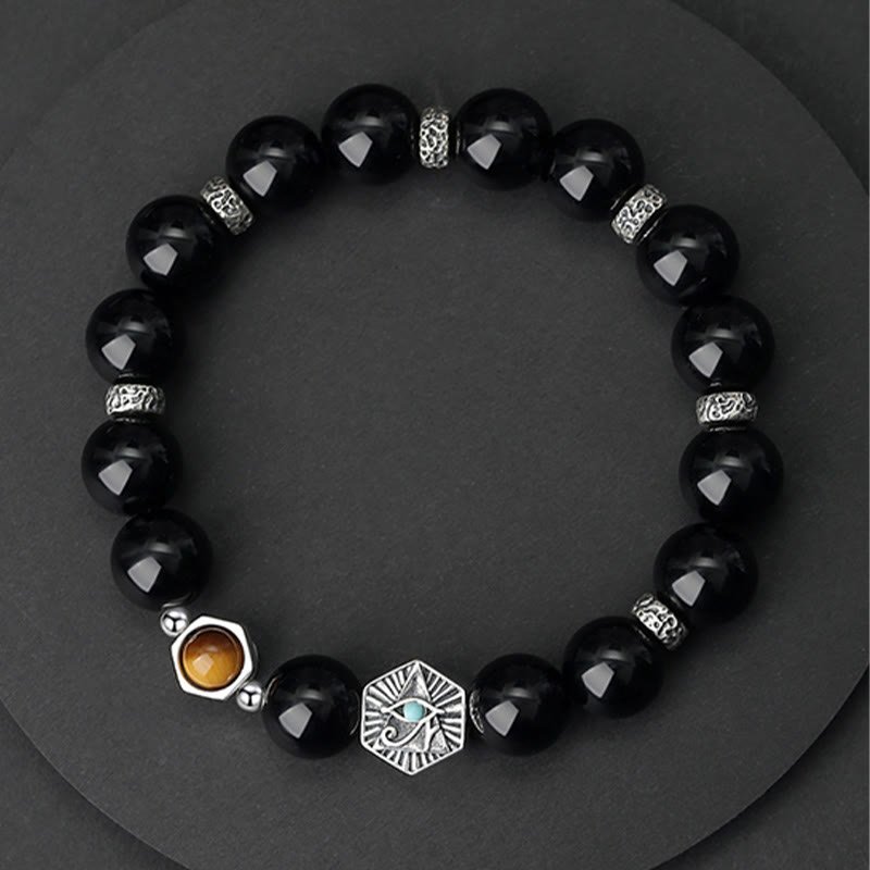 Buddha Stones 925 Sterling Silver Black Obsidian Tiger Eye Eye of Providence Purification Bracelet
