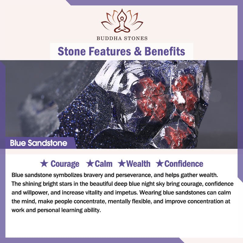 Blue sandstone symbolizes bravery and perseverance. and helps gather wealth. The shining bright stars in the beautiful deep blue night sky bring courage. confidence and willpower. and increase vitality and impetus. Wearing blue sandstones can calm the mind. make people concentrate. mentally flexible. and improve concentration at work and personal learning ability.
