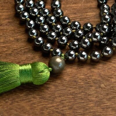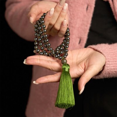 Hematite Tassel Powerful Bracelet is crafted with 108 natural hematite beads. symbolizing grounding and strength. The design features a vibrant green tassel. representing renewal and balance. This bracelet is ideal for spiritual practices. promoting focus and emotional stability. Each bead holds the energy of grounding. making it a meaningful accessory for those seeking a connection to inner strength and harmony.💕
