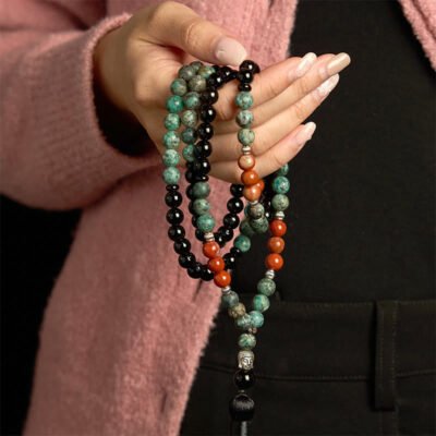 Be the first to review “Buddha Stones 108 Mala Natural Black Onyx Red Jasper Turquoise Beads Buddha Head Tassel Protection Bracelet”