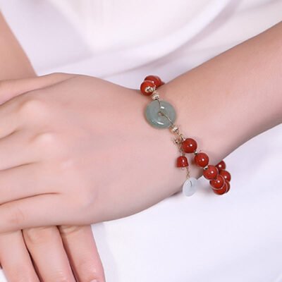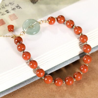 14k Gold Red Agate Peace Buckle bracelet combines elegance with meaningful symbolism. Featuring a jade peace buckle. red agate. copper coin. and gourd charm. this bracelet symbolizes confidence and prosperity. Crafted with high-quality materials. it is perfect for those who appreciate beautiful and significant jewelry. adding a touch of sophistication and positive energy to any outfit.💕