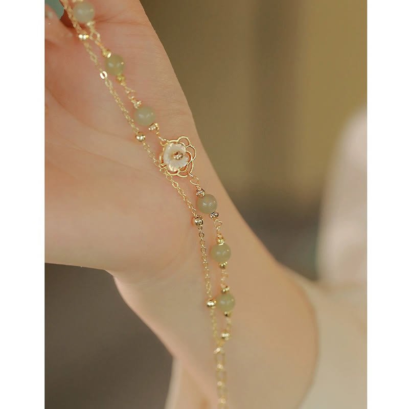 Buddha Stones 14K Gold Plated Jade Butterfly Tridacna Stone Flower Double Layer Luck Bracelet