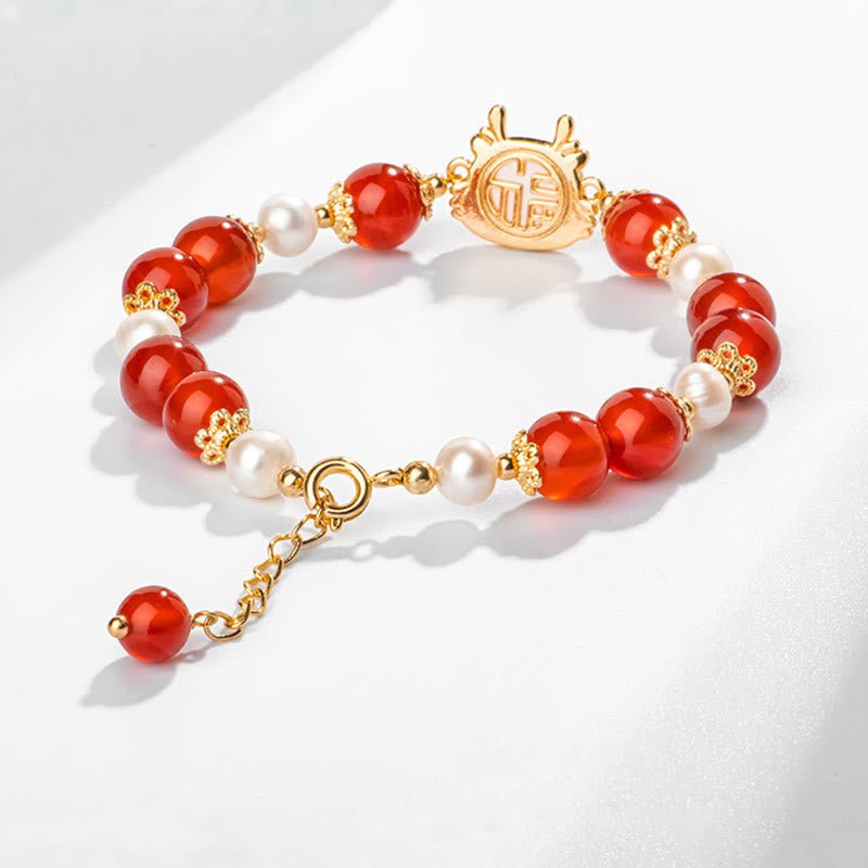 Buddha Stones 14K Gold Plated Year Of The Dragon Natural Red Agate Pearl Protection Fu Character Chain Bracelet (Extra 30% Off | USE CODE: FS30)