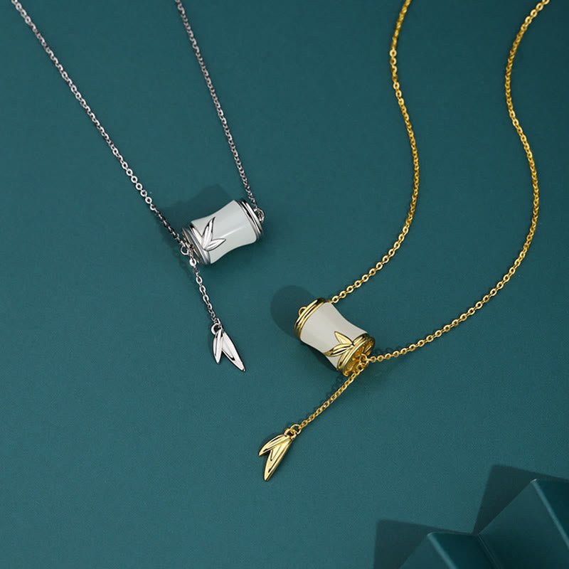 Buddha Stones 925 Sterling Silver 22K Gold Hetian White Jade Bamboo Leaf Luck Necklace Pendant Bracelet