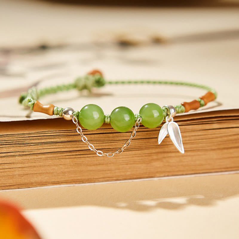 Buddha Stones 925 Sterling Silver Bamboo Leaves Hetian Jade Chalcedony Beads Blessing Braided Bracelet
