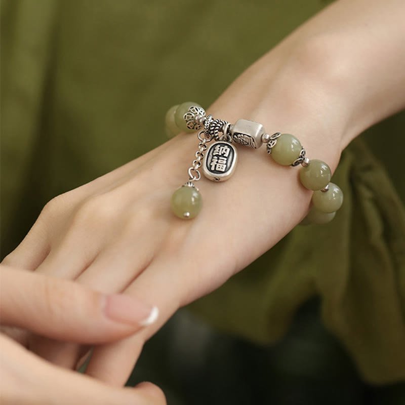Buddha Stones 925 Sterling Silver Hetian Jade Beads Luck Bracelet