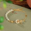 The Buddha Stones Hetian Jade Bracelet elegantly captures the essence of tranquility and good fortune. Made from 925 sterling silver. it features a Hetian jade peace buckle and a lotus design. symbols of purity and luck. This bracelet is ideal for those who value spiritual serenity and cultural symbolism in their jewelry. It’s particularly suited for individuals seeking a graceful accessory that embodies traditional Chinese beliefs. offering a perfect blend of style and meaningful symbolism for everyday wear.