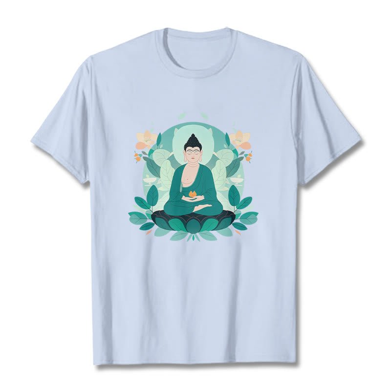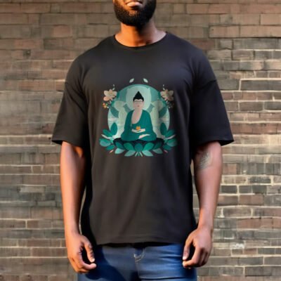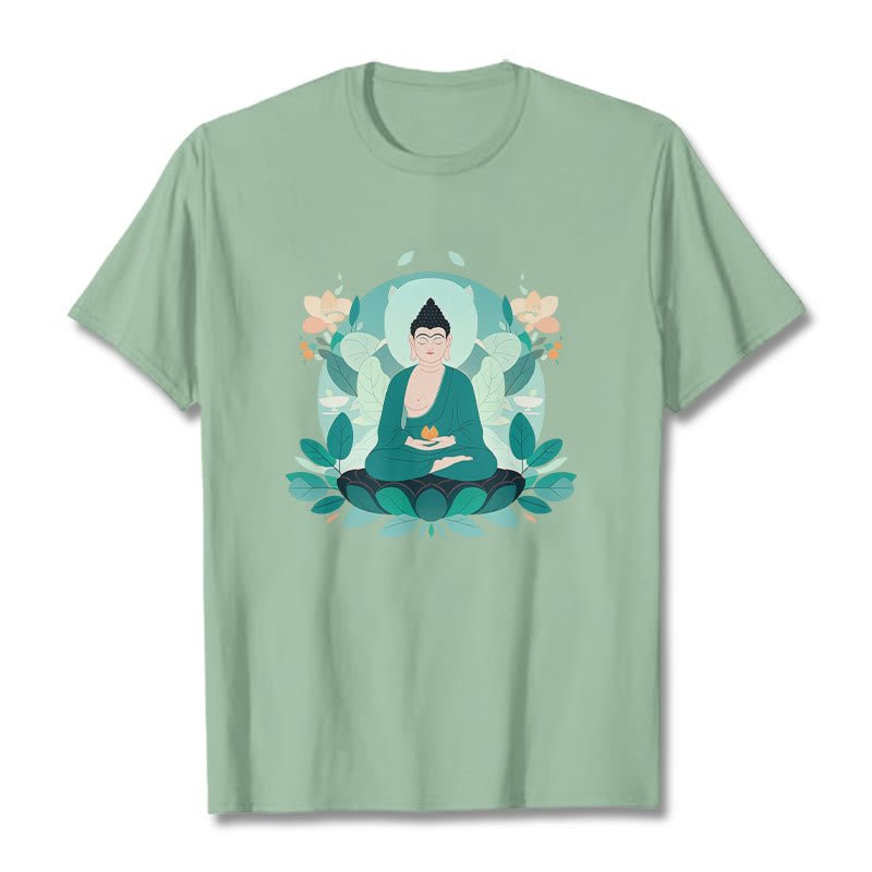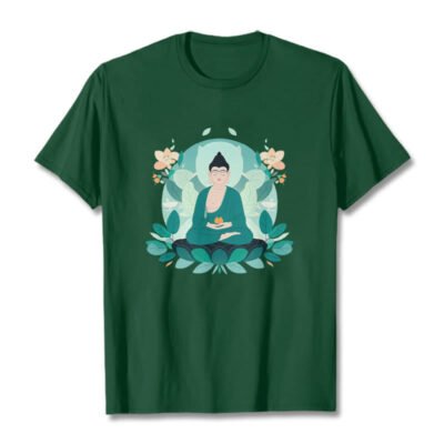 Close Eyes Green Leaf Buddha T-shirt features a serene Buddha with green leaf accents. symbolizing tranquility and growth. Made from comfortable. high-quality fabric. this t-shirt inspires a sense of calm and mindfulness. Perfect for daily wear or meditation sessions. it serves as a reminder to stay grounded and peaceful.