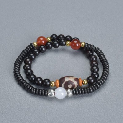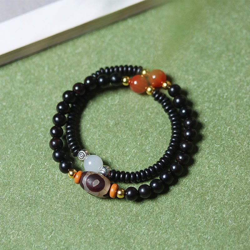 Ebony Sandalwood Balance Bracelet features black Ebony beads. Green Sandalwood. and a Dzi bead. symbolizing grounding and protection. Accented with Red Agate and alloy elements. this double-wrap bracelet promotes calm and emotional stability. The calming energy of Sandalwood and the protective properties of the Dzi bead make this bracelet ideal for those seeking balance and inner peace in their daily lives.💕