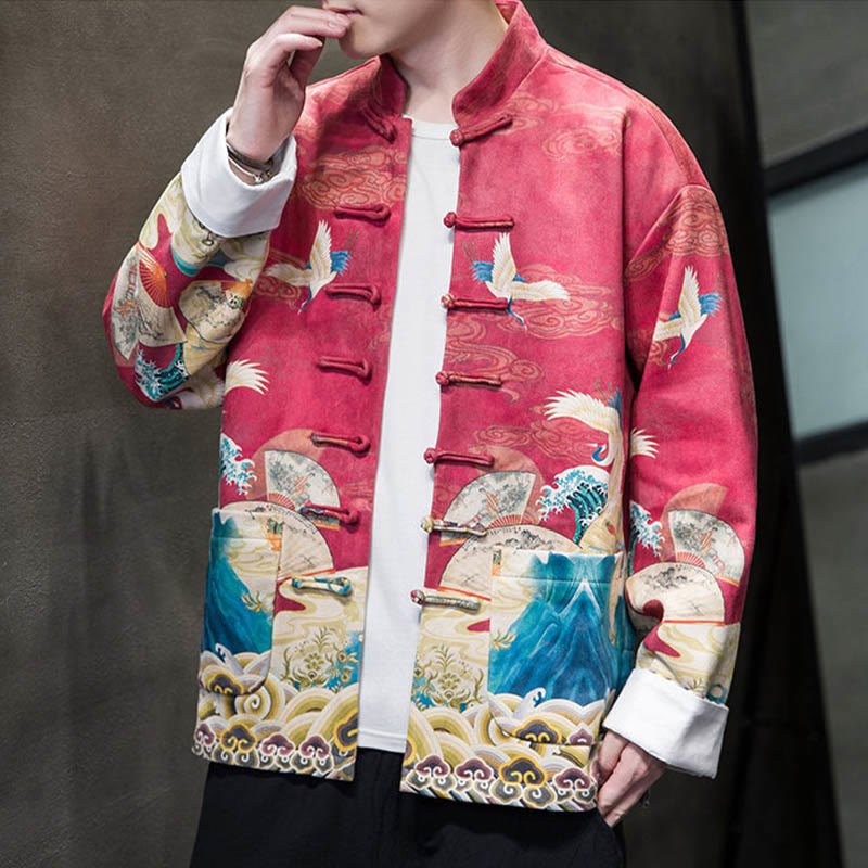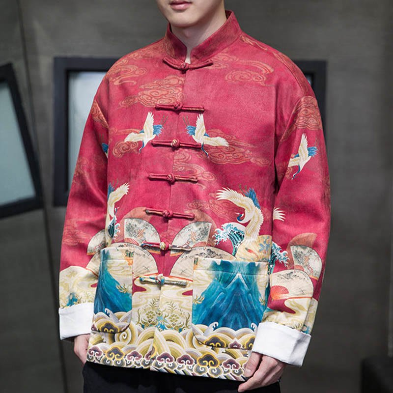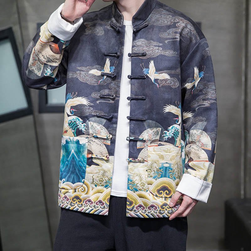 Buddha Stones Frog-Button Chinese Tang Suit Crane Character Long Shirt Cotton Suede Men Jacket Clothing