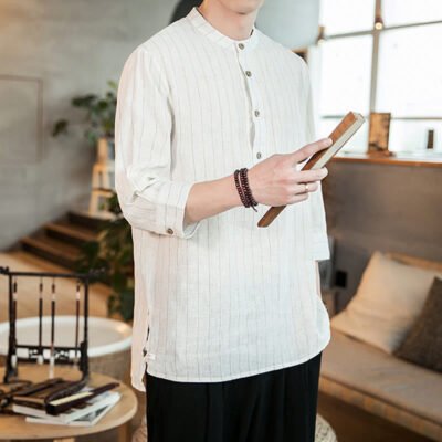 Half Button Striped Men’s Shirt is crafted from breathable linen. offering comfort and a light. airy fit. The three-quarter sleeves provide a relaxed look. while the half-button design adds a unique touch. The subtle striped pattern adds dimension and depth. making it a versatile choice for those seeking simplicity and natural elegance.💕