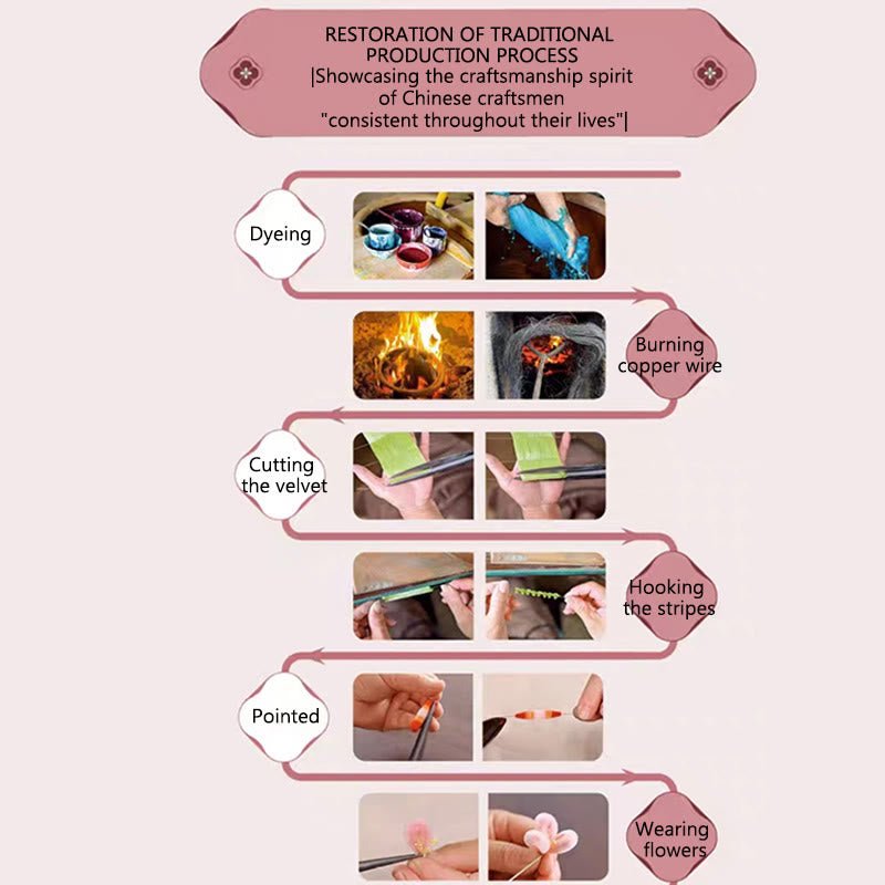 The popularity of Yangzhou velvet flowers can be traced back to 1.300 years ago. In spring. Li Xian. one of the Emperors of the Tang Dynasty. designated Yangzhou velvet flowers as imperial palace flowers to reward his beloved concubines. In ancient Yangzhou. the flower-making industry was very developed and it was a famous production area of ​​craft flowers in China. Among the flower-making in Yangzhou. velvet flowers have the earliest history. the most varieties. and the greatest influence.