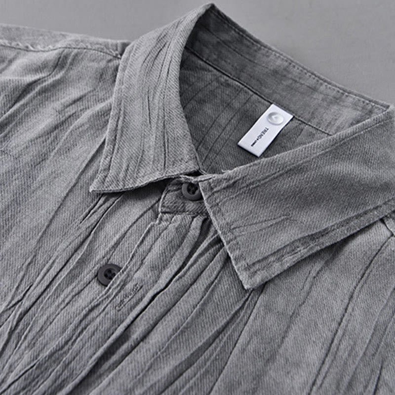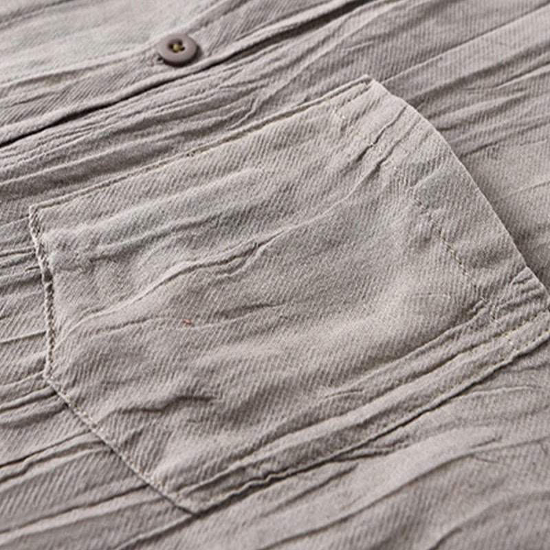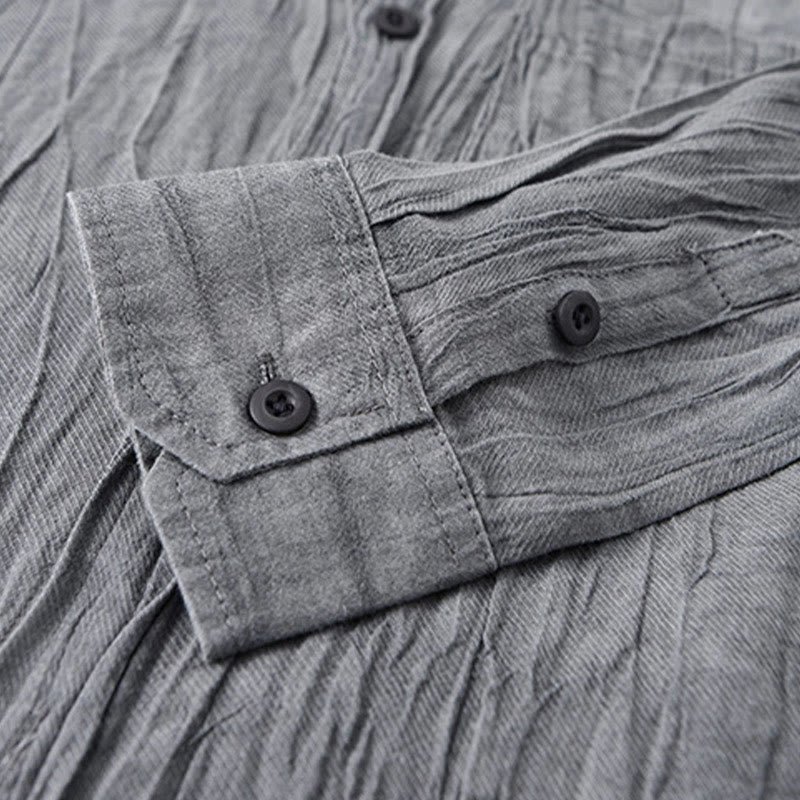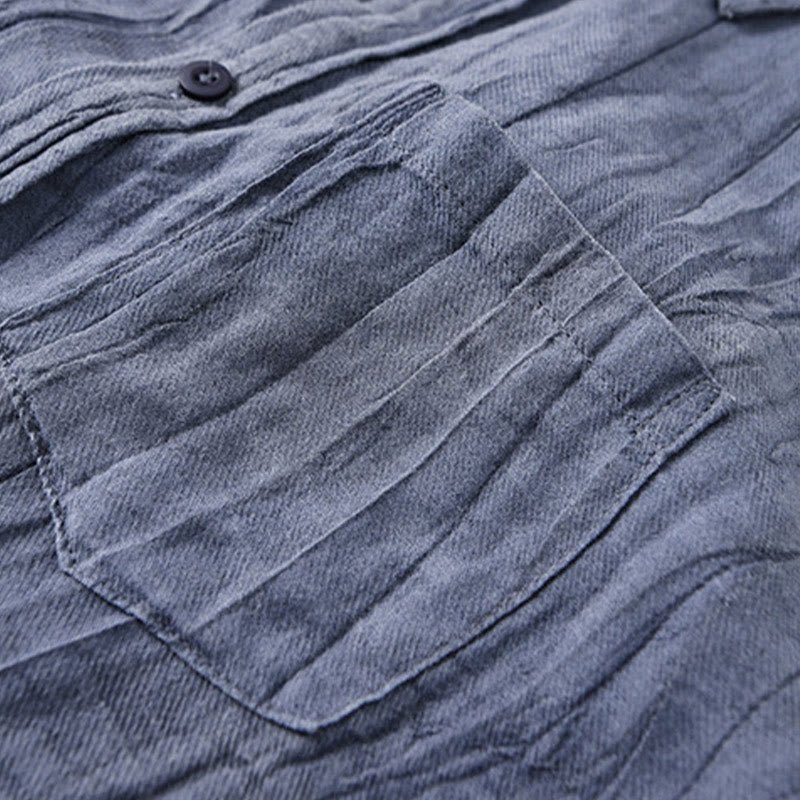 Buddha Stones Retro Pleats Buttons Men’s Long Sleeve Ramie Linen Shirt With Pockets