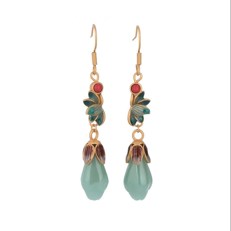 Buddha Stones Magnolia Flower Jade Pattern Luck Prosperity Drop Dangle Earrings