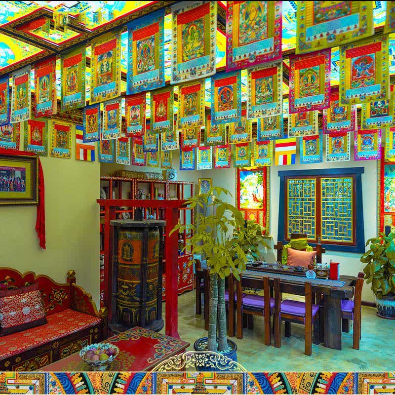 • Each flag features a large variety of prayers surrounding the center image of lungta. a Windhorse. Lungta is also the Tibetan word for ‘prayer flag’. Circulates a feeling of Harmony and increases the Spiritual Atmosphere. It Brings Spiritual Vibration carried by the wind across the house.