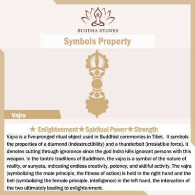 Vajra is a five-pronged ritual object used in Buddhist ceremonies in Tibet. It symbols the properties of a diamond (indestructibility) and a thunderbolt (irresistible force). As a symbol for the properties of a diamond. vajra signifies indestructibility as diamonds are the hardest of stones. As a symbol for the thunderbolt. vajra represents the irresistible force. It denotes cutting through ignorance since the god Indra kills ignorant persons with this weapon.