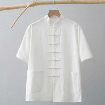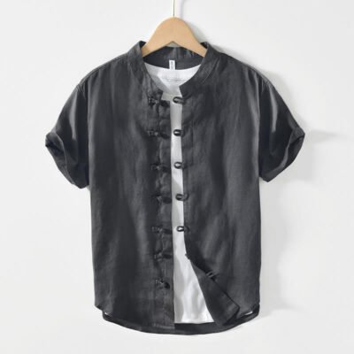 Buddha Stones Daily Casual Plain Chinese Frog-Button Men’s Short Sleeve Cotton Linen Shirt