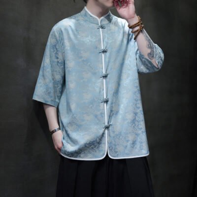 Buddha Stones Dragon Embroidery Frog-button Polyester Men’s Jacket Shirt Clothing With Pockets