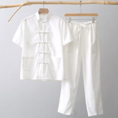 Buddha Stones Tang Frog-Button Short Sleeve Shirt Wide Leg Pants Men’s Suit