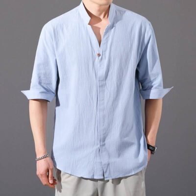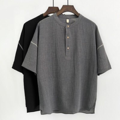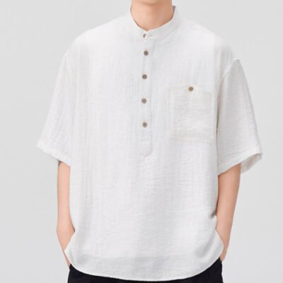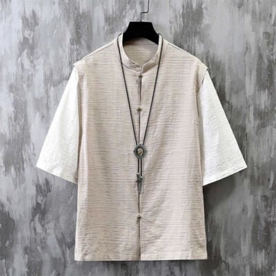 Buddha Stones Summer Solid Color Tang Suit Design Men’s Half Sleeve Linen Shirt With Pockets