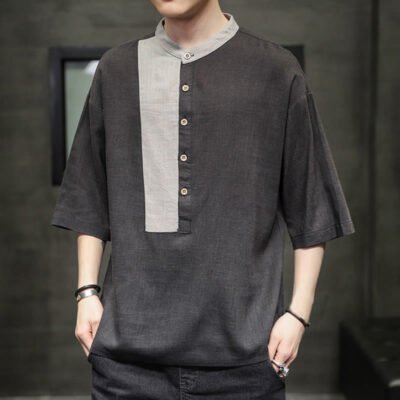 Buddha Stones Summer Half Buttons Color Matching Design Half Sleeve Men’s Cotton Linen Shirt