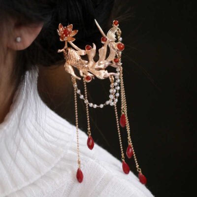 Buddha Stones Chinese Style Koi Fish Flower Tassel Red Agate Copper Gold Plated Hairpin Hair Comb