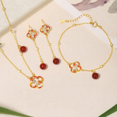 Buddha Stones 925 Sterling Silver Four Leaf Clover White Jade Red Agate Abundance Necklace Pendant