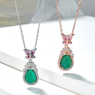 Buddha Stones 925 Sterling Silver Green Chalcedony Butterfly Zircon Courage Necklace Pendant