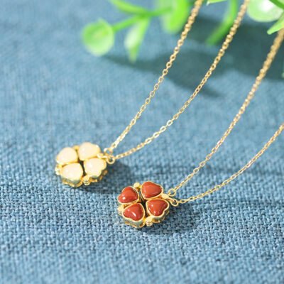 Buddha Stones 925 Sterling Silver Four Leaf Clover White Jade Red Agate Abundance Necklace Pendant