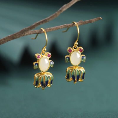 Buddha Stones 925 Sterling Silver Hetian White Jade Red Agate Cute Fish Happiness Drop Earrings