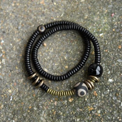 Buddha Stones Ebony Wood Green Sandalwood Copper Brass Dzi Bead Black Onyx Calm Double Wrap Bracelet