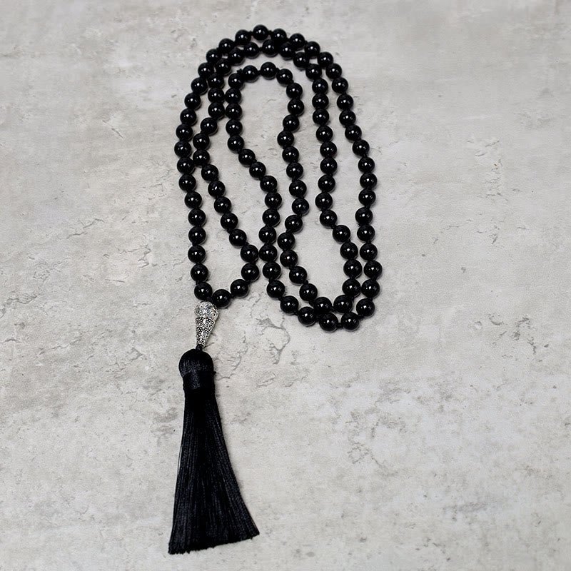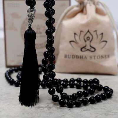 The Buddha Stones 108 Mala Black Onyx Beads Necklace is a powerful tool for yoga. meditation. and prayer. Made with high-quality Black Onyx. this mala offers protection. strength. and focus. and is handmade with natural materials. Wear it as a bracelet or necklace and let it ground and protect you on your journey.
