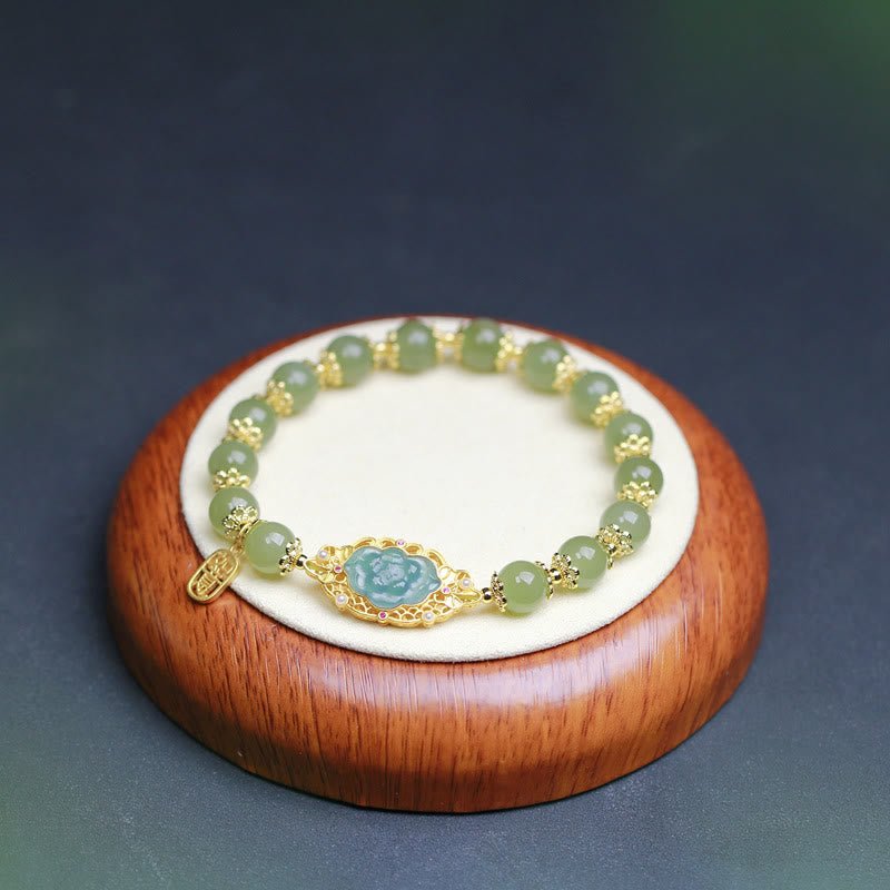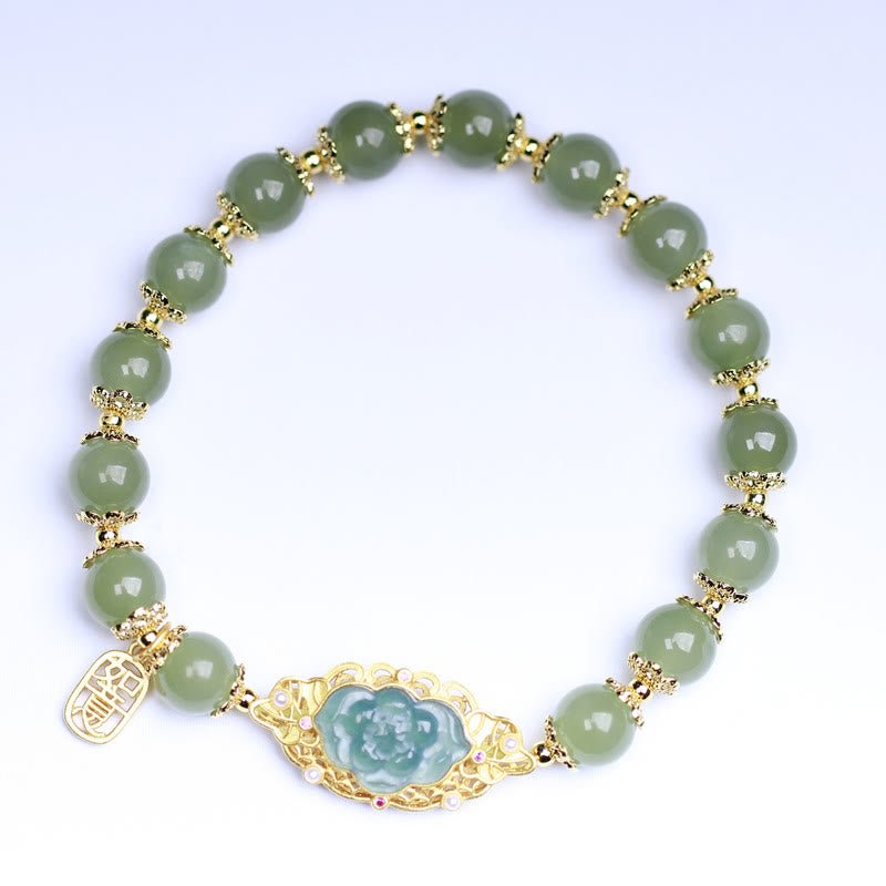 14K Gold Plated 925 Sterling Silver Hetian Jade Lotus Luck Bracelet