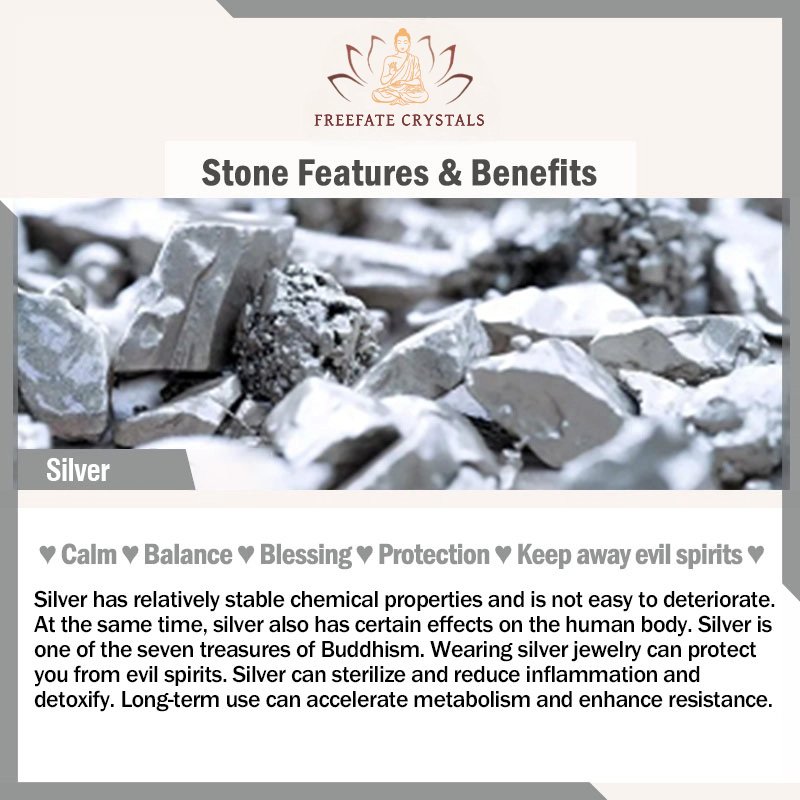 Silver has relatively stable chemical properties and is not easy to deteriorate. At the same time. silver also has certain effects on the human body. Silver is one of the seven treasures of Buddhism. Wearing silver jewelry can protect you from evil spirits. Silver can sterilize and reduce inflammation. detoxify and maintain health. and prolong life. Long-term use can accelerate metabolism and enhance resistance.