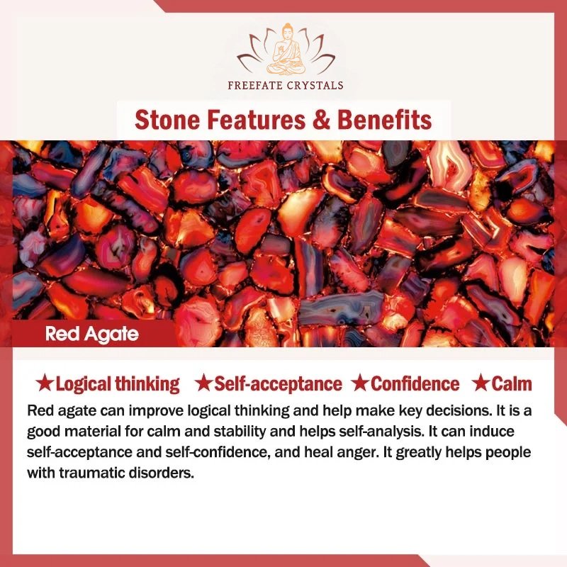 Red agate can improve logical thinking and help make key decisions. It is a good material for calm and stability and helps self-analysis. It can induce self-acceptance and self-confidence. and heal anger. It greatly helps people with traumatic disorders.