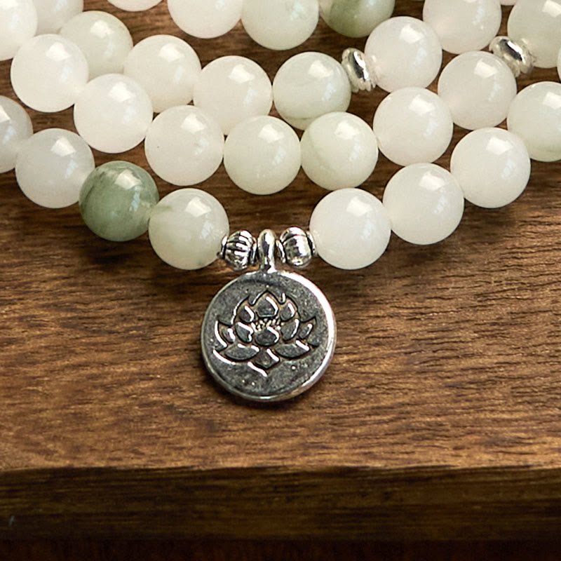 Buddha Stones 108 Mala Beads Natural Tianshan Jade Lotus Luck Bracelet Mala Bracelet BS 1
