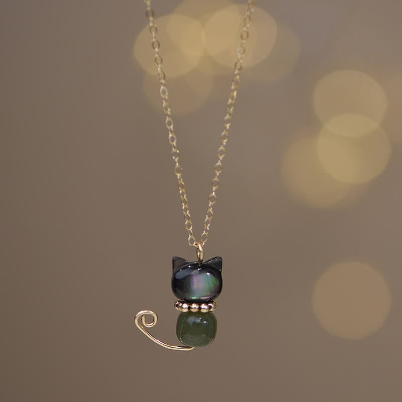 Buddha Stones 14K Gold Plated Pearl Hetian Jade Shell Luck Cat Kitten Necklace Pendant