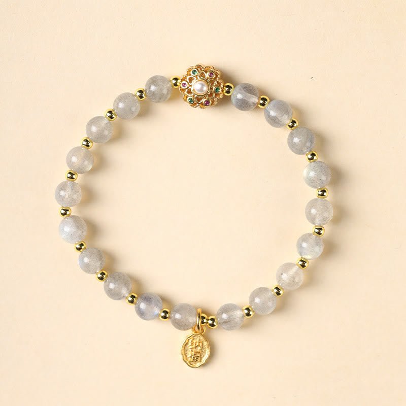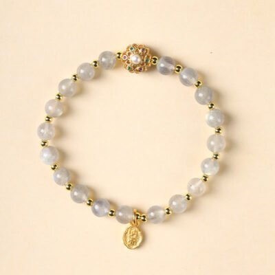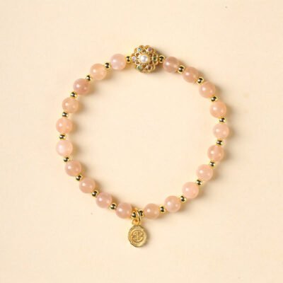 Experience tranquility and positivity with the Buddha Stones Bracelet. Adorned with 14K gold plating. this bracelet showcases natural strawberry quartz. labradorite. and sun stone. The centerpiece is a ‘Fu’ character charm. symbolizing blessings and good fortune.