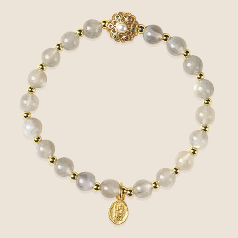 Buddha Stones 14K Gold Plated Natural Strawberry Quartz Labradorite Sun Stone Fu Character Positive Charm Bracelet