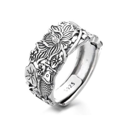 Koi Fish Lotus Flower ring embodies prosperity and beauty. Featuring intricate designs of koi fish and lotus flowers. this ring symbolizes growth and good fortune. Crafted from high-quality sterling silver. it offers both elegance and cultural significance. Perfect for those who appreciate meaningful jewelry. this ring adds a touch of sophistication and positive energy to any ensemble.💕