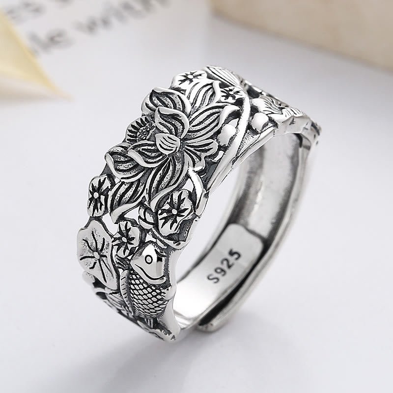 Buddha Stones 925 Sterling Silver Koi Fish Lotus Flower Prosperity Ring