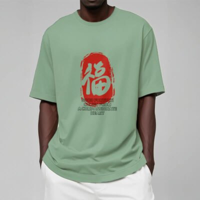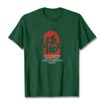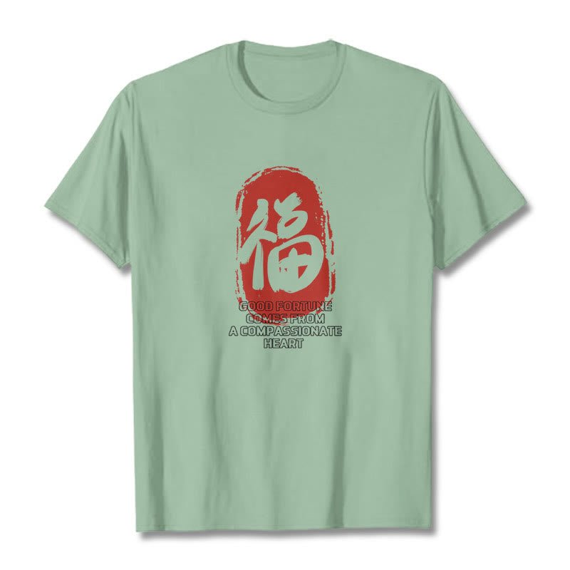 Fu Good Fortune Tee T-shirt features the bold Chinese “Fu” character symbolizing good fortune. alongside an inspiring message about compassion. Made from soft. durable cotton. it reminds the wearer that true fortune arises from a compassionate heart. This simple yet powerful design serves as a meaningful reminder to cultivate kindness and generosity. bringing positive energy into everyday life.