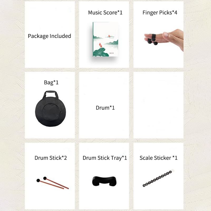 • Package: Manual*1. Scale Sticker *1. Drum Stick*2. Tray*1. Bag*1. Drum*1. Finger Picks*4