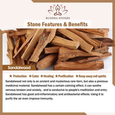 Sandalwood not only is an ancient and mysterious rare item. but also a precious medicinal material. Sandalwood has a certain calming effect. it can soothenervous tension and anxiety. and is conducive to people’s meditation and entry.Sandalwood has good anti-inflammatory and antibacterial effects. Using it topurify the air even improve immunity.